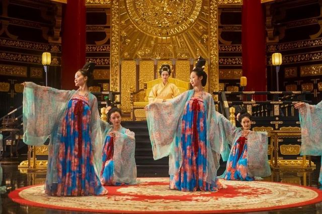 中秋夜游天堂名堂,大殿载歌载舞,仿佛回到千年前大唐盛世。中秋之日,一群盛装歌姬白天登阙楼一睹恢弘盛世,傍晚在河边放逐水灯许愿、思念家乡,夜晚在华丽的舞台歌舞升平。一派大国盛世、国泰民安的场景。
