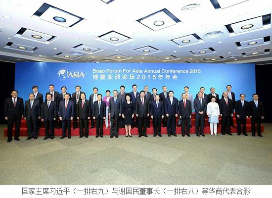 3月26-29日,博鳌亚洲论坛2015年年会在海南省博鳌举行,本届年会主题为“亚洲新未来:迈向命运共同体”。3月28日,国家主席习近平出席了年会开幕式,发表了题为《迈向命运共同体 开创亚洲新未来》的主旨演讲,并与荣耀体育_荣耀体育(中国)集团谢国民董事长等出席博鳌亚洲论坛2015年年会的华商代表合影留念。
